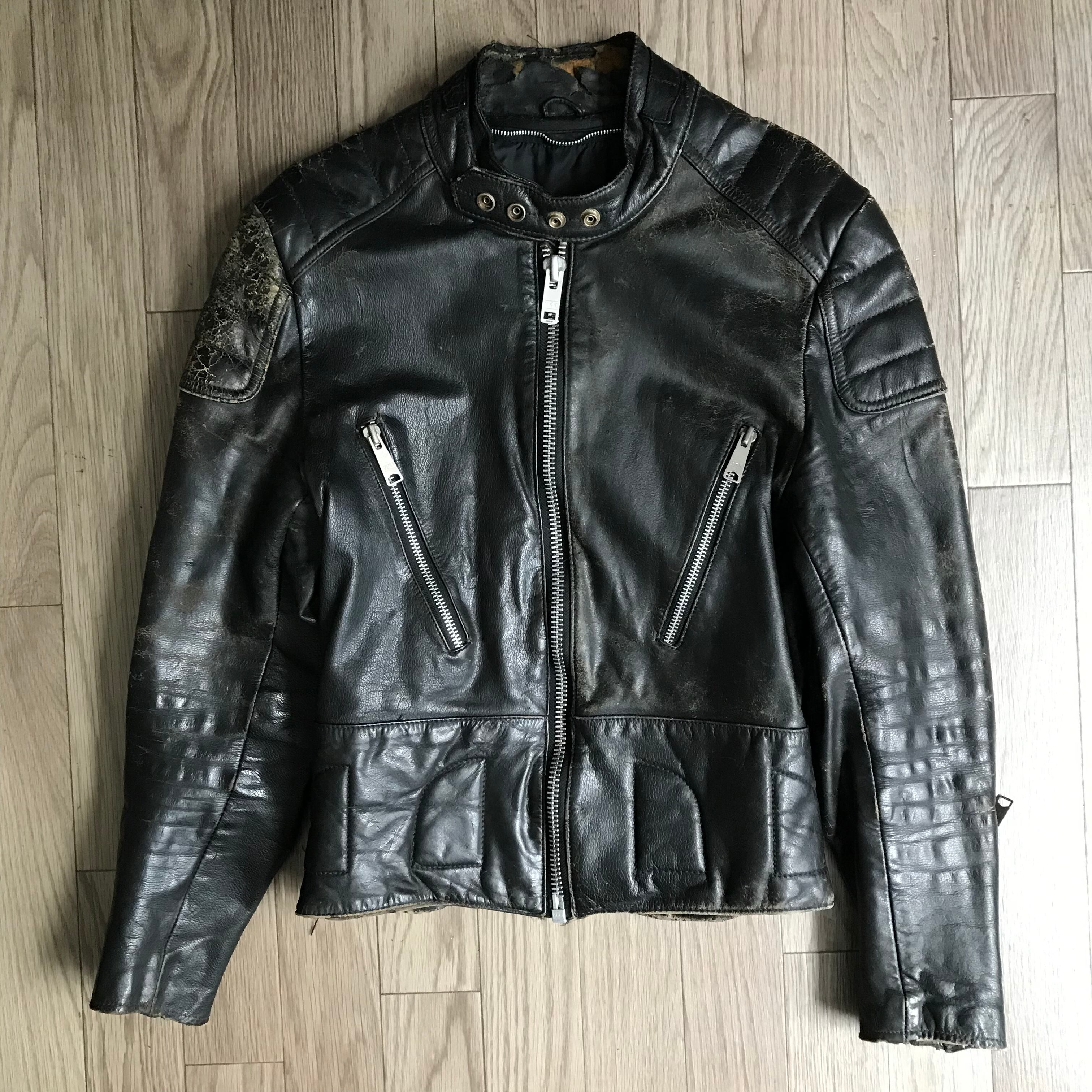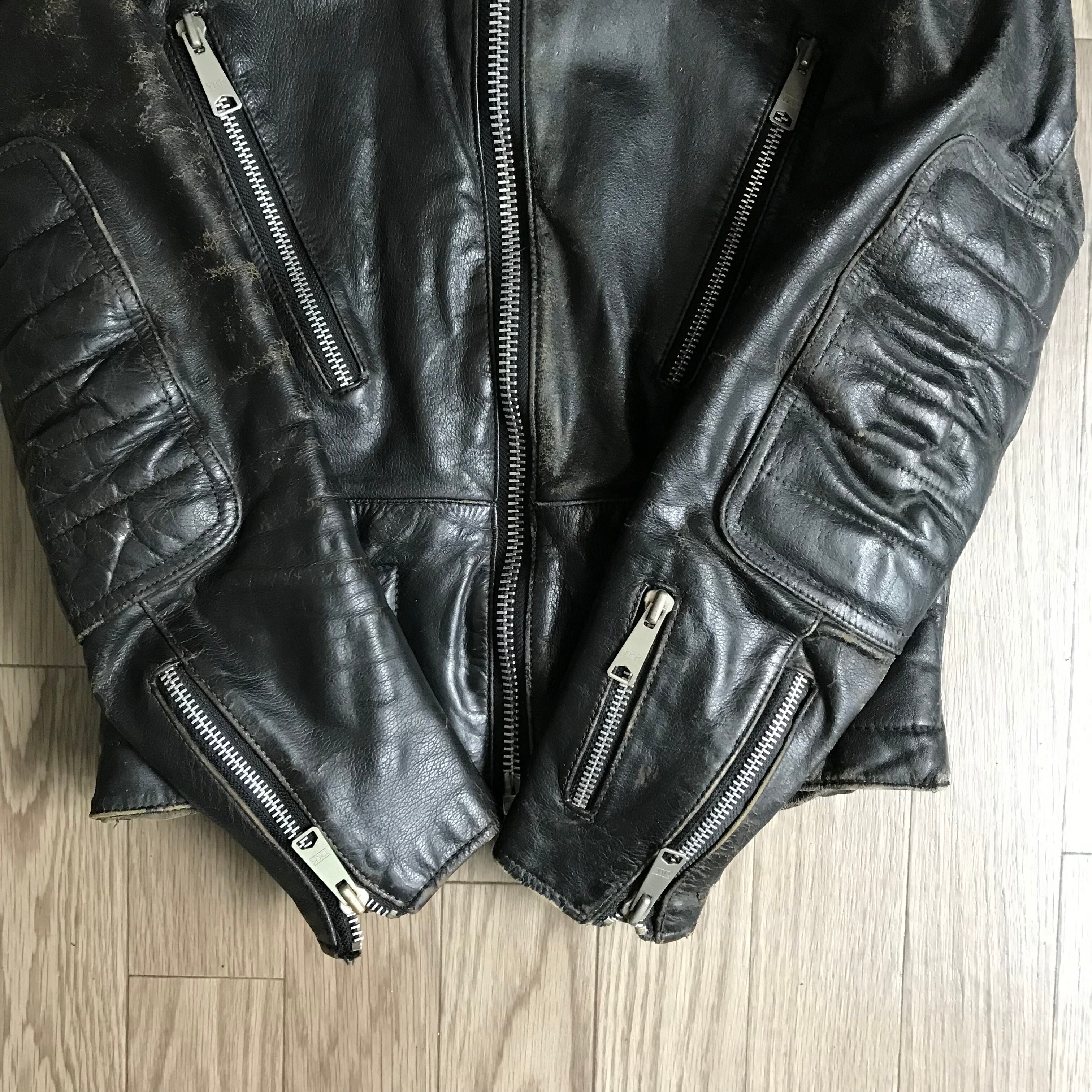 けっこうダメージあります。特にエリまわりと袖がレザーの劣化で破れてます。