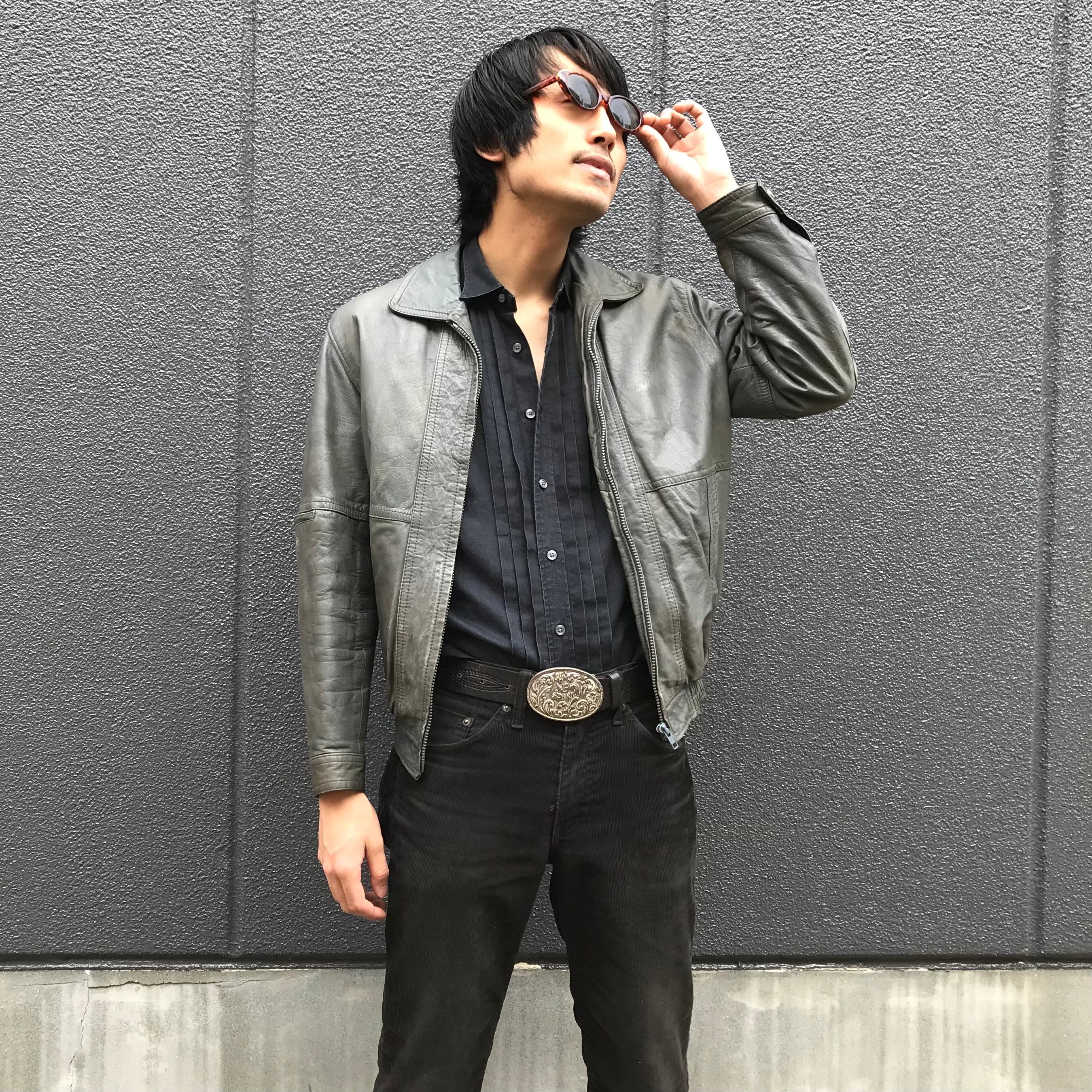 落ち着いた印象のグレー革ジャン。