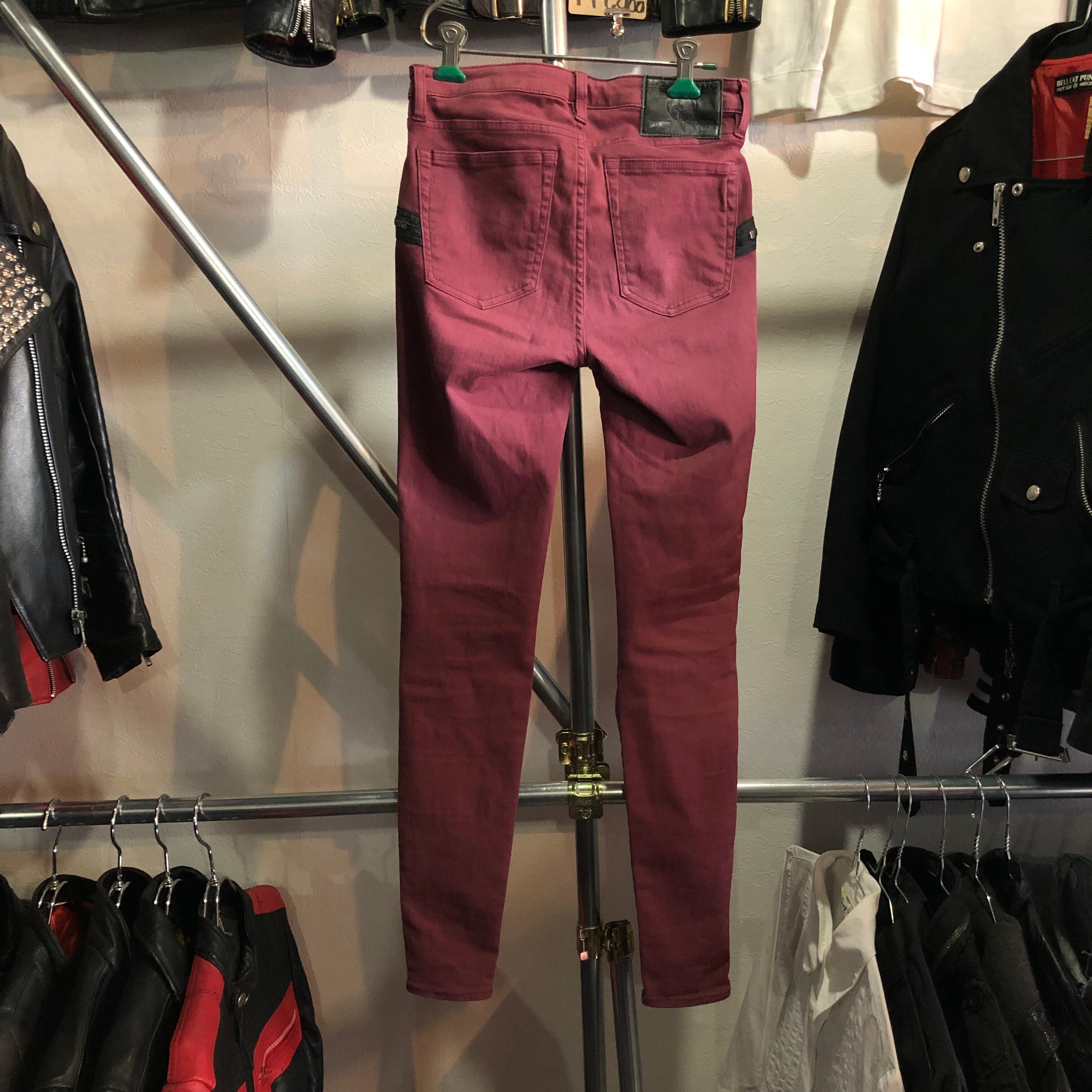 エンジ色のジップパンツ。