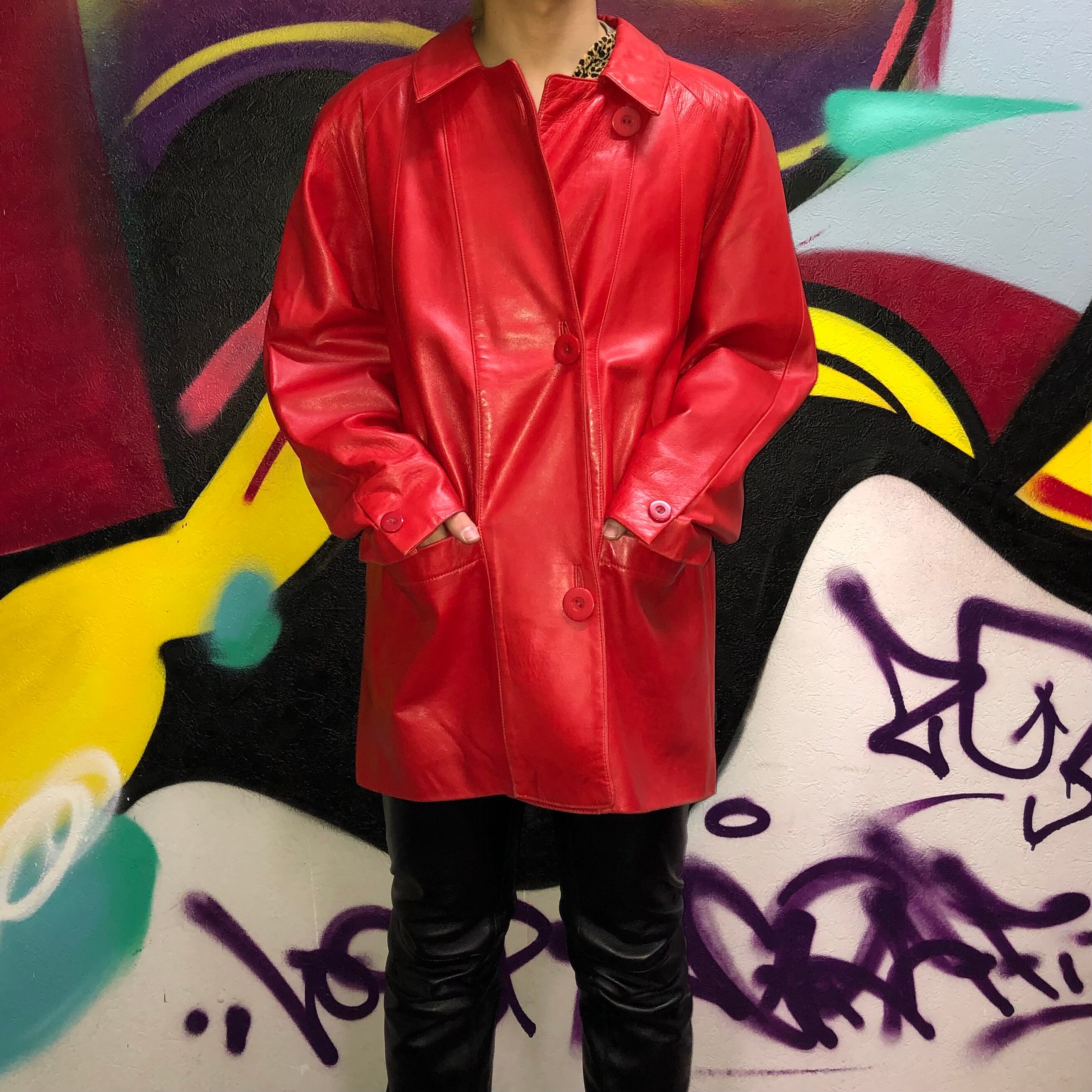 鮮やかな赤のレザージャケット。